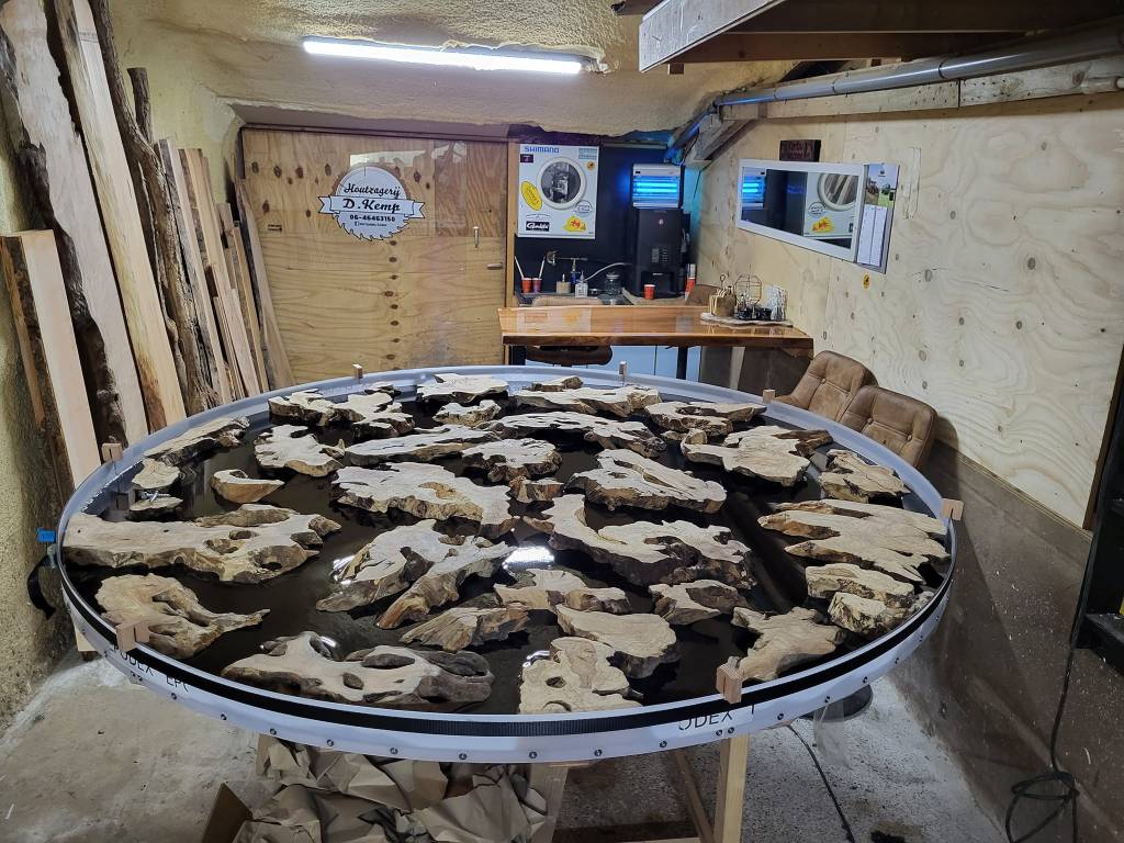 Dit recent afgeronde project is echt een succes! Het opvallende Epoxyblad, maar liefst 210 cm in diameter, voegt een bijzondere touch toe aan de ruimte. De olijfwortelstukken, rechtstreeks uit Turkije, geven het blad karakter en unieke details.
