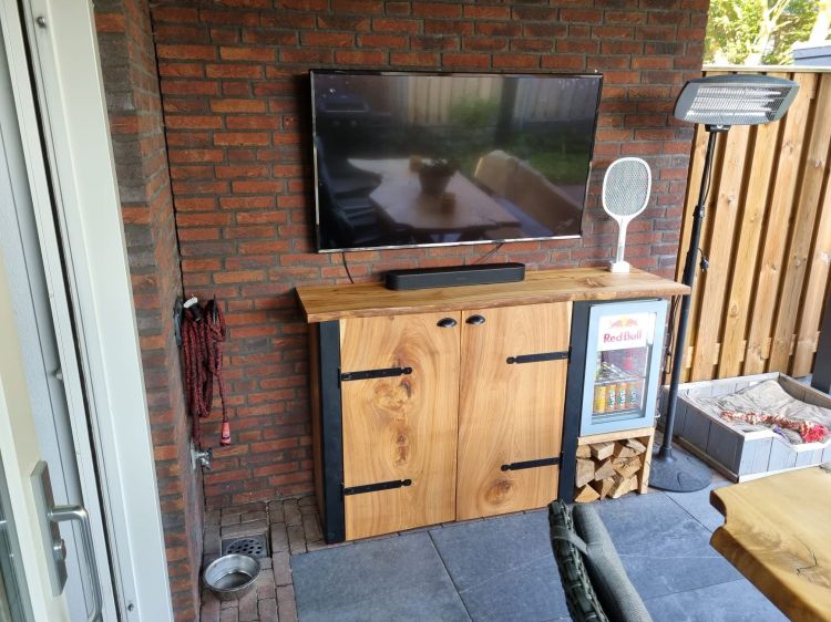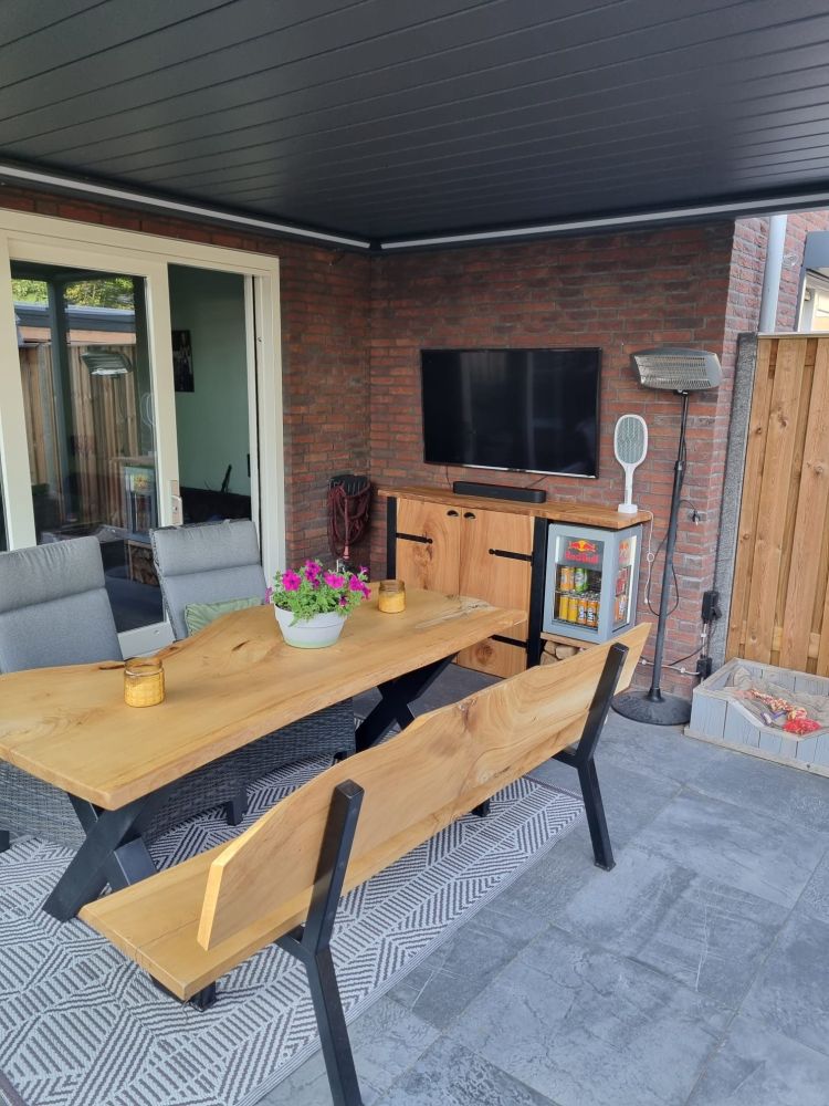 Laatst leverden we een prachtige set aan een gewaardeerde klant: een houten bank en tafel, harmonieus vergezeld door een bijpassende tv-kast waar ook ruimte is gemaakt voor een koelkast.
